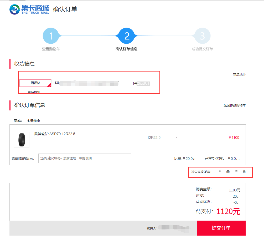 4. 详细填写收货人信息、订单信息、发票信息等,如下图: